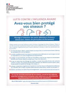 Devant la recrudescence de cas d’influenza aviaire hautement pathogène en Europe dans l’avifaune sauvage et dans les élevages, en tant que détenteurs de volailles ou autres oiseaux captifs destinés uniquement à une utilisation non commerciale, vous devez impérativement mettre en place les mesures suivantes :